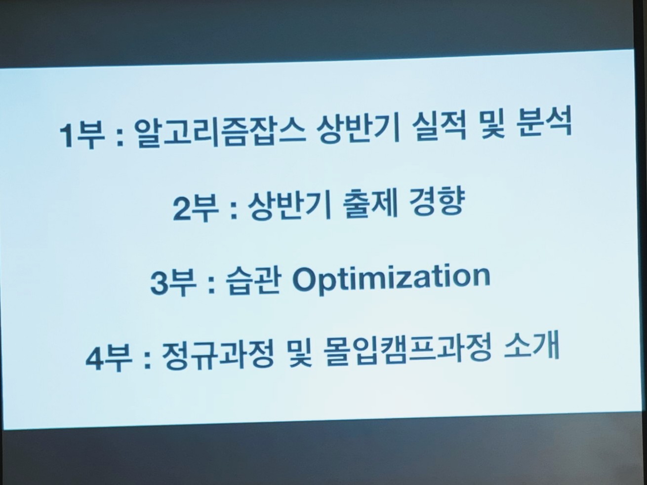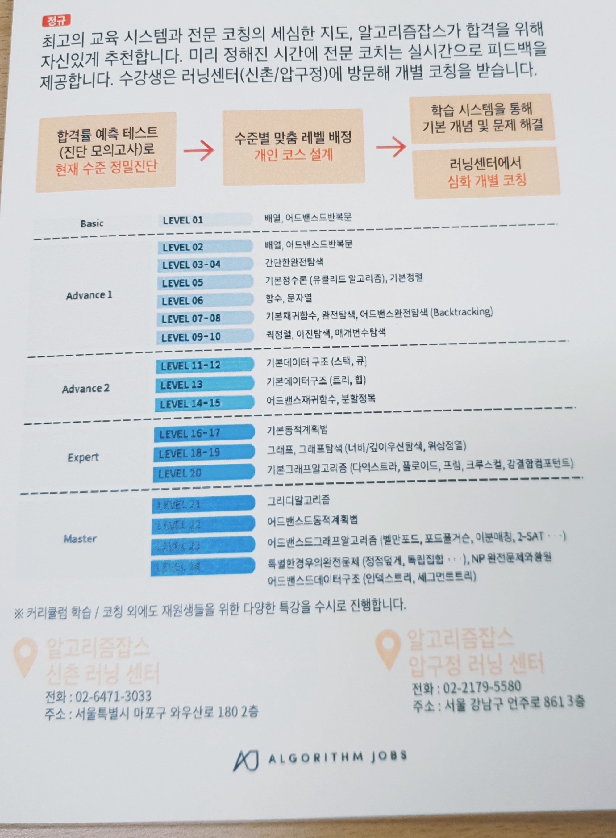 알고리즘 잡스에서 나눠주셔서 대기 시간에 읽은 유인물. 레벨 분류가 흥미로웠다. 11시 10분경 간단한 소개 후 강연자인 손진호 대표님이 들어오셨고 '이번에 커트라인이 올라갔다'는 얘기로 세미나는 시작됐다. 원래는 3시간에 한 문제만 풀어도 붙을 수 있던게 이번엔 같은 시간에 2문제를 풀어야 합격할 수 있게 상향되었다고. 그래서 알고리즘 잡스에선 개인의 습관을 더욱 최적화 하는 쪽으로 방향을 잡았다고 말씀하셨는데 처음엔 이게 무슨 말인지 몰랐다. 커트라인이 올라갔는데 왜 개인의 습관을 최적화하는 걸 솔루션이라고 하시지? 그러나 세미나가 진행되면서 알고리즘 잡스가 정말 핵심을 제대로 짚고 있구나라는 걸 느꼈다.