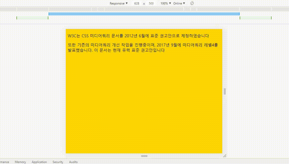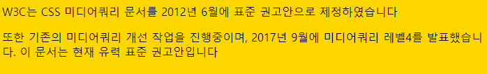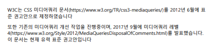 123456789101112131415161718192021222324252627282930313233343536373839404142434445<!DOCTYPE html><html lang="en"><head><meta charset="UTF-8"><meta name="viewport" content="width=device-width, initial-scale=1.0"><title>Document</title><style>/*0 ~ 767 gold , 768~1024 lightblue , 1025 ~ lightpink0 ~ 767 모바일 , 768~1024 태블릿 , 1025 ~ PC*/body {background: lightpink;}@media screen and (max-width : 767px) {body { background: gold;}}@media screen and (min-width : 768px) and (max-width : 1024px) {body { background: lightblue;}}a {text-decoration: none;color: black;}@media print{a:after{display: inline;content : '(' attr(href) ')';}}</style></head><body><p>W3C는 <a href="https://www.w3.org/TR/css3-mediaqueries/">CSS 미디어쿼리 문서</a>를 2012년 6월에 표준 권고안으로 제정하였습니다</p><p>또한 기존의 미디어쿼리 개선 작업을 진행중이며, 2017년 9월에 <a href="https://www.w3.org/Style/2012/MediaQueriesDisposalOfComments.html">미디어쿼리 레벨4</a>를 발표했습니다. 이 문서는 현재 유력 표준 권고안입니다</p></body></html>width의 변화에 따라 배경색이 변하는 간단한 코드인데