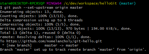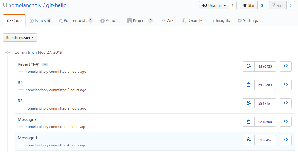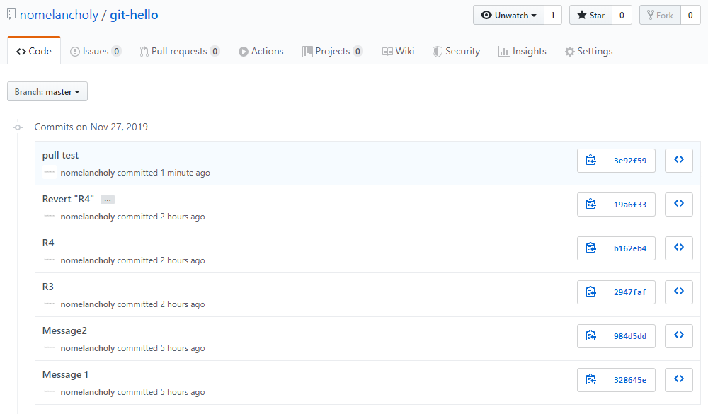 원격 저장소나 helloGit 과 commit 내역이 같아진 걸 확인할 수 있다.