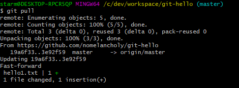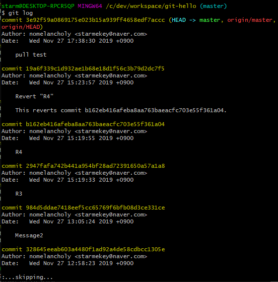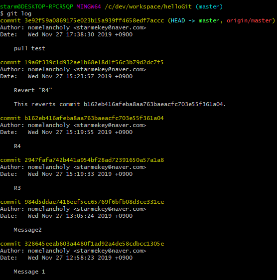 위와 같이 pull test라는 메모와 함께 commit된 것이 있을거고 helloGit에서 git log를 봐도