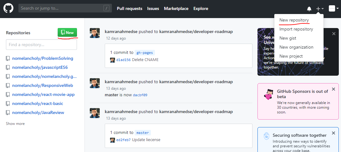 저장소는 표시한 부분 중 하나를 클릭해서 생성할 수 있다. 클릭해서