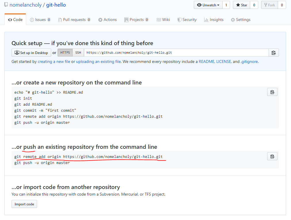 1git remote add 별칭 원격저장소의 주소를 의미한다. 근데 이건 의미고 우리는 저기 친절히 적혀있는 git remote add 명령을 그냥 복사해서
