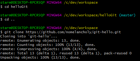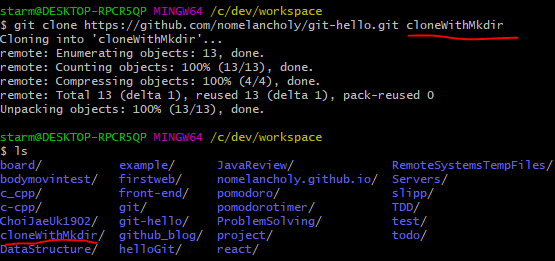 주의할 점은 원격 저장소의 이름을 가진 폴더 하나가 생성된다는 것이다.