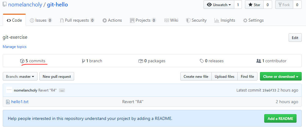 지역 저장소에 저장되었던 내용이 원격 저장소에 잘 올라가 있음을 확인할 수 있고 표시한 commits 부분을 클릭하면