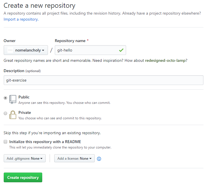 public / private / README 자동 생성 여부를 의도에 따라 체크하고 Create repository버튼을 누르면 된다