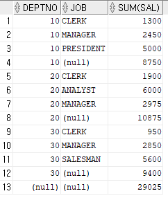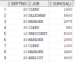 123SELECT DEPTNO, JOB, SUM(SAL)FROM EMPGROUP BY (DEPTNO,JOB );위와 같이 SELECT 문을 작성하면