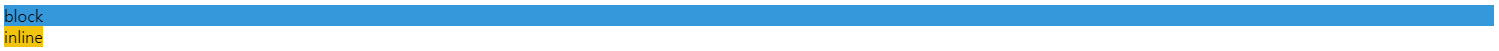 1234567891011121314151617181920212223242526<!DOCTYPE html><html lang="ko"><head><meta charset="UTF-8"><title>블록 레벨 요소 / 인라인 요소</title><style>div {background: #3498db;display: inline;}span {background: #f1c40f;width: 500px;display: block;}</style></head><body><div>block</div><span>inline</span></body></html>display 속성을 활용해 div를 inline요소로 span을 block-level 요소로 바꾸면