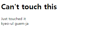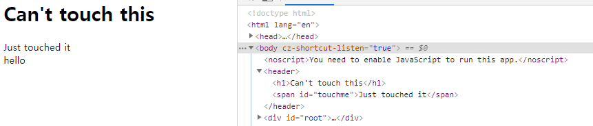 1234567891011121314151617181920212223242526<!DOCTYPE html><html lang="en"><head><meta charset="utf-8" /><meta name="viewport" content="width=device-width, initial-scale=1" /><meta name="theme-color" content="#000000" /><metaname="description"content="Web site created using create-react-app"/><title>React App</title></head><body><noscript>You need to enable JavaScript to run this app.</noscript><!-- 주목 --><header><h1>Can't touch this</h1><span id="touchme"></span></header><!-- 주목 --><div id="root"></div></body></html><!-- index.html -->위와 같이 root div 형제 효소인 header 엘리먼트 내부엔 기존 react로는 접근할 수 없지만