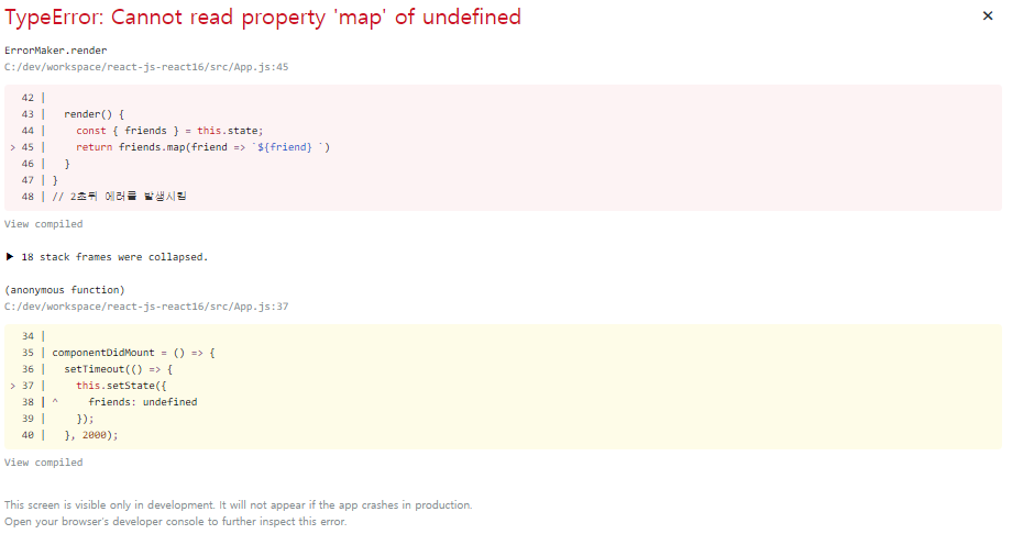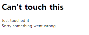 12345678910111213141516171819202122232425262728293031323334353637383940414243444546474849505152535455565758596061626364656667686970717273747576777879import React, { Component, Fragment } from 'react';import { createPortal } from "react-dom";const BoundaryHOC = ProtectedComponent =>class Boundary extends Component {state = {hasError: false};componentDidCatch = () => {this.setState({hasError: true});};render() {if (hasError) {return <ErrorFallback />;} else {return <ProtectedComponent />;}}};// Higher Oreder Components를 활용해 Error Boundary를 활용하는 예// ProtecteComponent를 함수로 받아// componentDidCatch를 활용해 error 발생을 감지하면// Proteced Component 대신 ErrorFallback을 반환해 전체 UI가 깨지는 걸 막는다class ErrorMaker extends Component {state = {friends: ["kyeo-ul", "guem-ja"]}componentDidMount = () => {setTimeout(() => {this.setState({friends: undefined});}, 2000);};render() {}}// 2초뒤 에러를 발생시킴const PErrorMaker = BoundaryHOC(ErrorMaker);// BoundaryHOC로 보호class Portals extends Component {render() {return createPortal(<Message />, document.getElementById("touchme"));}}const PPortals = BoundaryHOC(Portals);// BoundaryHOC로 보호const ErrorFallback = () => "Sorry something went wrong";// 에러 발생 시 리턴할 문구const Message = () => "Just touched it";function App() {return (<div className="App"><PPortals /><PErrorMaker /></div>);// 보호하고 있는 component 리턴}export default App;위와 같이 코드를 작성하면
