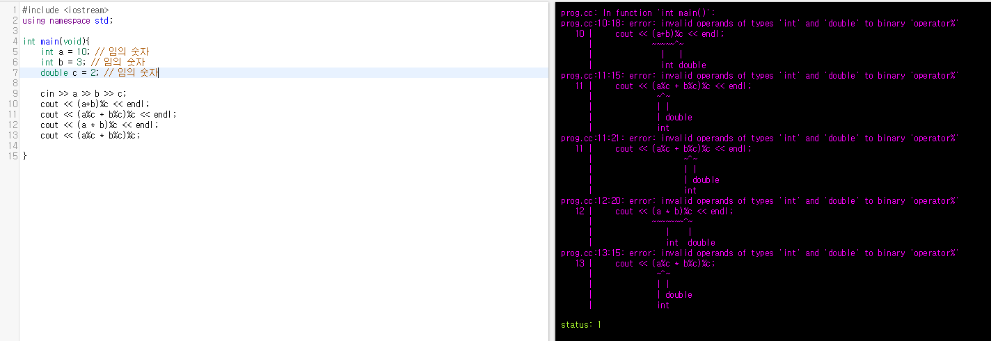 1234567891011#include <iostream>using namespace std;int main(void){double a = 10.0;double b = 3.0;cout << a%b ;// 컴파일 에러}cs 같은 코드를 C++로 짜고 실행시키면 컴파일 에러가 발생한다