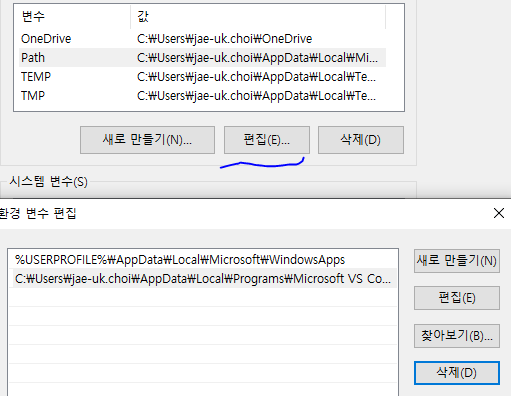Path를 선택해 편집 버튼을 눌러보면 환경 변수 편집 목록이 나오는데