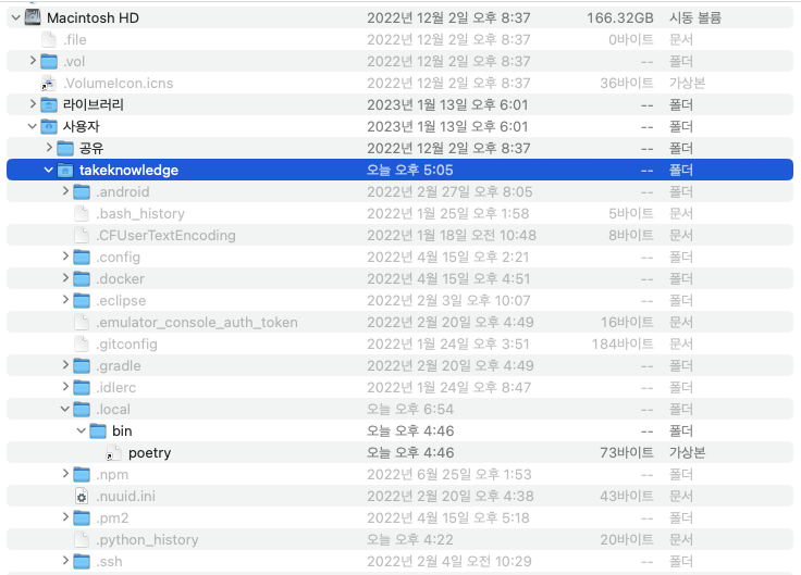 이 상태에서 shift + cmd + . 을 입력해서 숨김 폴더를 보이게 처리합니다.