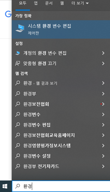 시작 버튼을 누르고 windows 검색창에 환경이라고만 쳐도 환경 변수 편집 프로그램이 나옵니다