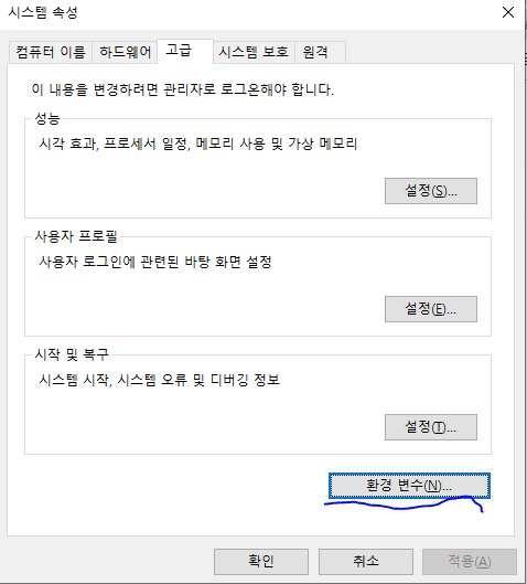 진입한 후 밑줄친 환경 변수 버튼을 클릭하면 나오는 화면에서