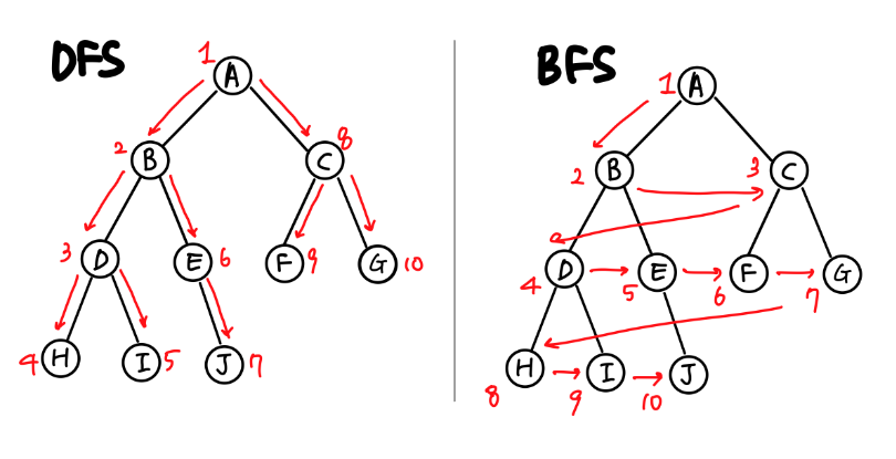 DFS (깊이 우선 탐색) 와 BFS(너비 우선 탐색) 는 대표적인 탐색 알고리즘입니다. 동작하는 방식은 이름 그대로입니다.