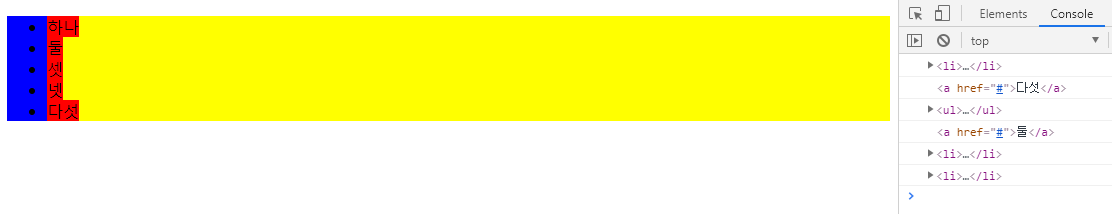 123456789101112131415161718192021222324252627282930313233343536373839<!DOCTYPE html><html lang="en"><head><meta charset="UTF-8"><title>자바스크립트 이벤트</title><style>ul{background: blue;}li{background: yellow;}a{background: red;text-decoration: none;color : black;}</style></head><body><ul><li><a href="#">하나</a></li><li><a href="#">둘</a></li><li><a href="#">셋</a></li><li><a href="#">넷</a></li><li><a href="#">다섯</a></li></ul><script>var ul = document.querySelector('ul');ul.addEventListener("click",function(e){console.log(e.target);});</script></body></html>사실 별 거 없다. 이렇게 ul 하위에 li > a 가 여러개 있을 경우