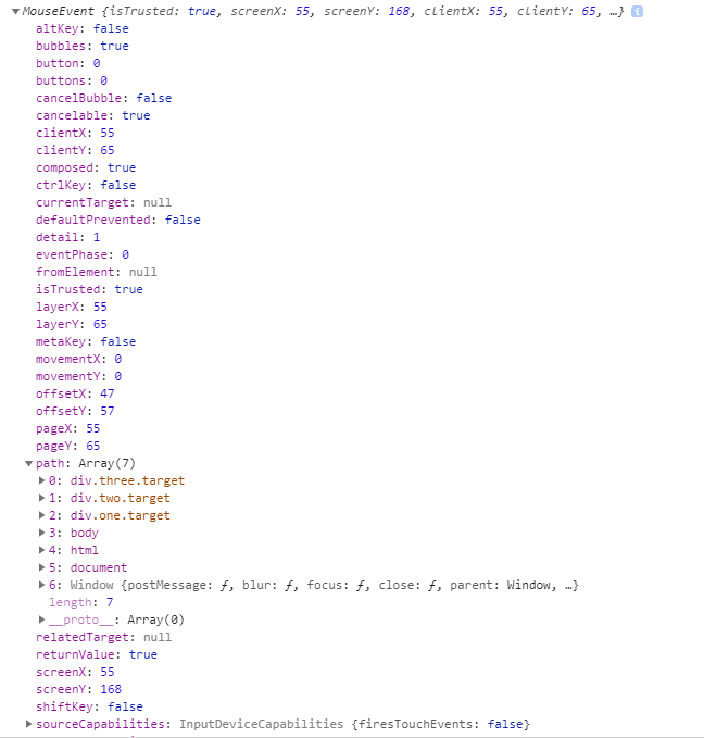 12345678var targets = document.querySelectorAll('.target');targets.forEach(function(target) {target.addEventListener('click', logEvent);});function logEvent(event) {console.log(event);}이렇게 event만 콘솔로 찍어봐도 알 수 있다