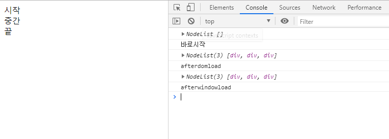 123456789101112131415161718192021222324252627<!DOCTYPE html><html lang="en"><head><meta charset="UTF-8"><title>DOMContentLoaded</title></head><body><script>window.onload = function(){var target = document.querySelectorAll('div');console.log(target);console.log("afterwindowload");}document.addEventListener("DOMContentLoaded", function() {var target = document.querySelectorAll('div');console.log(target);console.log("afterdomload");});var later = document.querySelectorAll('div');console.log(later);console.log("바로시작")</script><div>시작</div><div>중간</div><div>끝</div></body></html>이렇게 스크립트 태그를 바디 열림 태그 바로 아래 위치 시키고