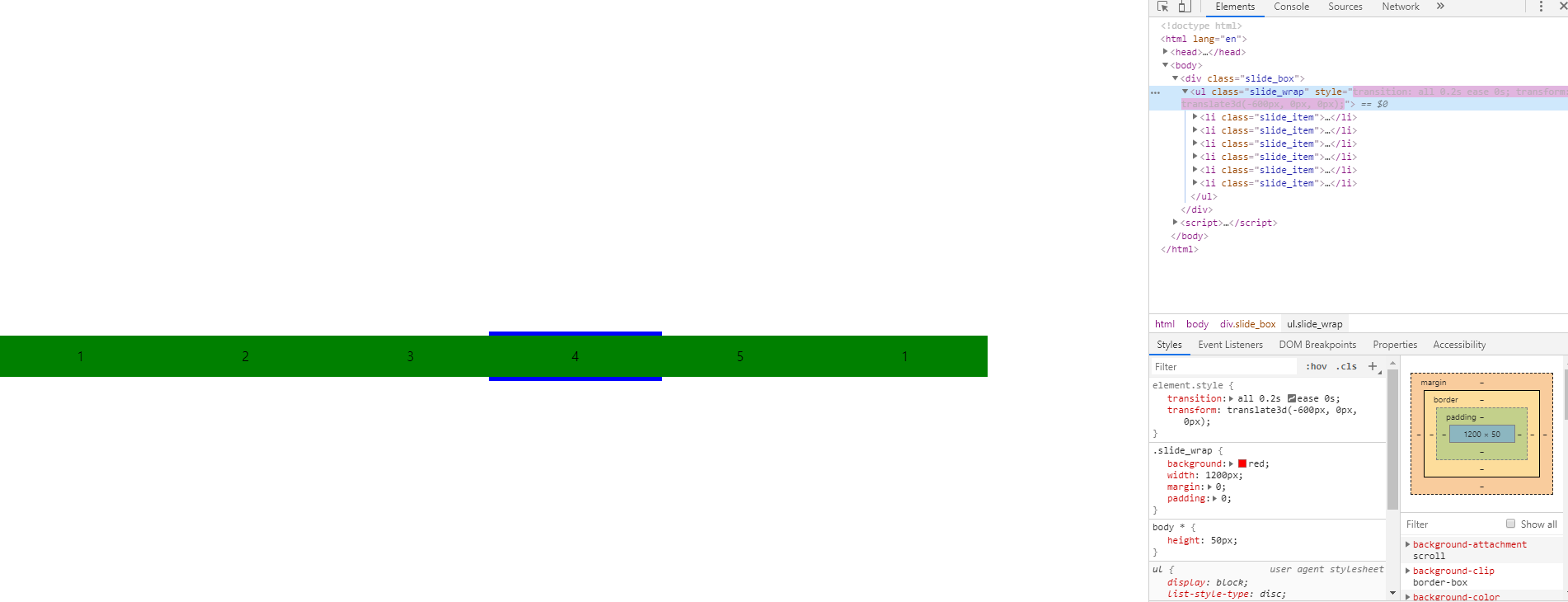 1234567891011121314151617181920212223242526272829303132333435363738394041424344454647484950515253545556<!DOCTYPE html><html lang="en"><head><meta charset="UTF-8"><title>슬라이드 무한 슬라이드</title><style src=></style><style>body * {height: 50px;}.slide_box{width: 200px;position: relative;left: 50%;margin-left: -100px;top: 400px;border: 5px blue solid;z-index: 100;}.slide_wrap{background: red;width: 1000px;margin: 0;padding: 0;}.slide_item{background: green;width: 200px;list-style: none;float: left;text-align: center;line-height: 50px;}.slide_item a{text-decoration: none;color : black;}</style></head><body><div class="slide_box"><ul class="slide_wrap"><li class="slide_item"><a href="#">1</a></li><li class="slide_item"><a href="#">2</a></li><li class="slide_item"><a href="#">3</a></li><li class="slide_item"><a href="#">4</a></li><li class="slide_item"><a href="#">5</a></li></ul></div><script>document.addEventListener("DOMContentLoaded",function(){//});</script></body></html>