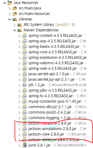 Libraries - Maven Dependencies 안에 databind 외에도, jackson-annotations, jackson-core 을 확인할 수 있다.