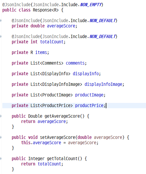 이렇게! 아래도 그냥 위의 멤버 변수들의 게터 세터 뿐이라 전체 스샷은 찍지 않았다. 다만 여기서 언급하고 싶은 게 있는데 바로 @JsonInclude 어노테이션이다.