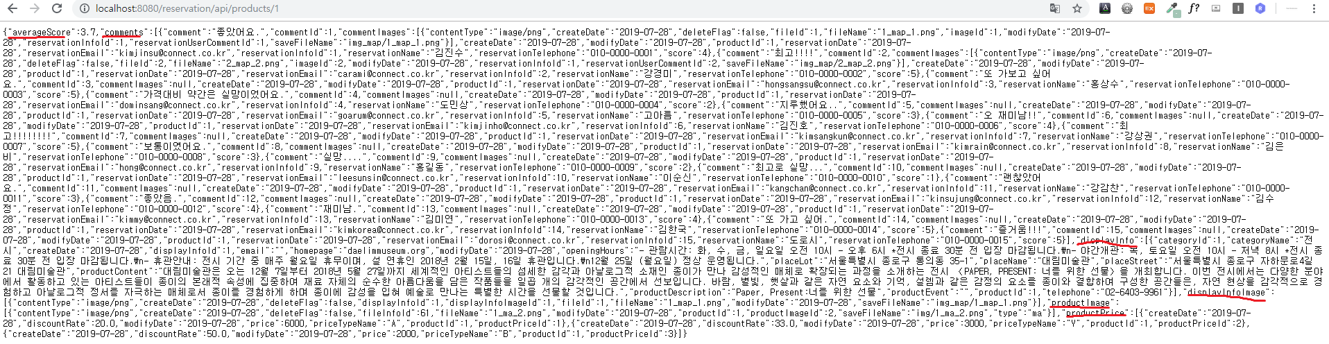 그게 바로 JsonInclude의 역할이다. 이 Response Dto는 지금 클래스 자체에 JsonInclude.Include.NON_EMPTY@JsonInclude(JsonInclude.Include.NON_EMPTY)를 선언하여 배열이 비어있을 경우 아예 Json으로 반환하지 않도록 했고, totalCount나 averageScore 위에는 @JsonInclude(JsonInclude.Include.NON_DEFAULT)를 선언해 기본 값, 그러니까 0이나 0.0이 값으로 들어올 경우 Json으로 반환하지 않도록 한 것이다.