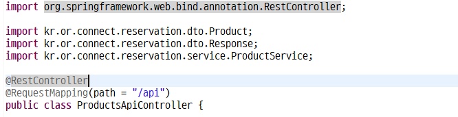 RestController는 Spring 4 에서 Rest API 또는 Web API를 개발하기 위해 등장한 애노테이션이다. 이전버전의 @Controller와 @ResponseBody를 포함한다. 만드는 방법은 간단하다. Controller 위에 @RestController 어노테이션을 붙여주면 된다.