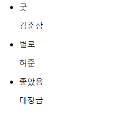 123456789101112131415161718192021222324252627282930313233343536373839404142434445464748<!DOCTYPE html><html lang="en"><head><meta charset="UTF-8"><meta name="viewport" content="width=device-width, initial-scale=1.0"><meta http-equiv="X-UA-Compatible" content="ie=edge"><title>Handelbar</title></head><body><ul id="commentUl"></ul><!-- 1. 템플레이팅할 html을 세팅한다. 이때 데이터 바인딩 시킬 부분은 --><!--{{바인딩시킬 데이터의 프로퍼티명}} 의 형태로 적는다. --><script type="template" id="commentTemplate"><li class="list_item"><div><div class="review_area"><p class="review">{{comment}}</p></div><div class="info_area"><div class="review_info"><span class="name">{{name}}</span></div></div></div></li></script><script type="text/javascript" charset="utf-8">// 데이터var data = {comment : '굿' ,name : "초보"}//2. htmlTemplate을 가져온후 Handlebars로 compile 한다.var commentTemplate = document.querySelector("#commentTemplate").innerHTML;var commentBindTemplate = Handlebars.compile(commentTemplate);//3. 컴파일한 템플릿에 데이터를 집어넣는다. 이 때 리턴값은 html로 나온다.var resultHtml = '';resultHtml += commentBindTemplate(data);// 4. 리턴받은 html을 target에 innerHTML로 세팅한다.var commentUl = document.querySelector("#commentUl");commentUl.innerHTML = resultHtml;</script></body></html>이 코드를 실행시키면 아래와 같이 잘 작동한다