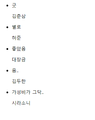 123456789var data = {comments : [{comment : '굿' ,name : "김춘삼" },{comment : '별로' ,name : "허준" },{comment : '좋았음' ,name : "대장금" },{comment : '음..' ,name : "김두한"},{comment : '가성비가 그닥..',name : "시라소니" }]}아주 쉽다. 템플릿 HTML만 아래와 같이 바꿔주면 된다