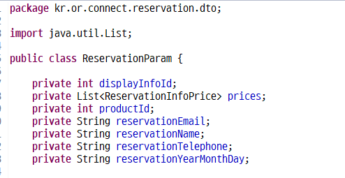 1234567891011@RestController@RequestMapping(path = "/api")public class ReservationsApiController {// 예약하기@PostMapping(path = "/reservations")public Reservations setReservations(@RequestBody ReservationParam reservationParam) {return reservationService.setReservation(reservationParam);}이렇게 @RequestBody 어노테이션을 선언하고 생성한 java 객체를 파라미터를 담을 변수로 적어주면
