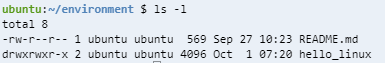 가장 앞의 README.md 앞에는 없지만 hello_linux 앞에는 있는 'd'는 이것이 디렉토리인지 파일인지 구분해주고