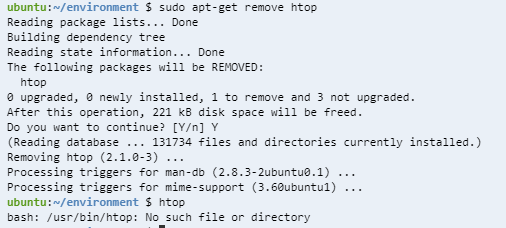 패키지가 잘 지워져서 htop을 입력했을 때 더는 실행되지 않는 걸 볼 수 있다