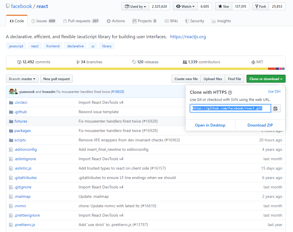 실습화면은 react의 github page ( https://github.com/facebook/react ) 에서 촬영(?) 했습니다