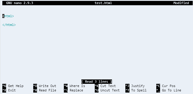 이렇게 nano 에디터가 실행된다. 이제 html 태그를 입력하고 파일을 저장해보자.