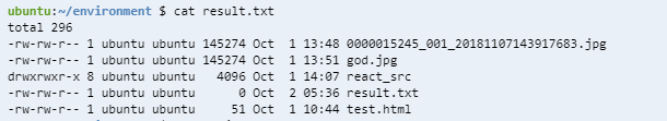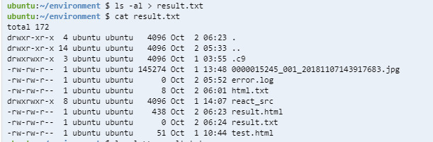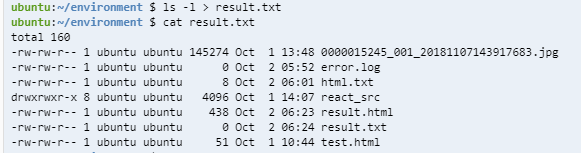 ls -l의 output을 reuslt.txt에 담기게 redirection 해놓고 cat의 내용을 확인해보면 위와 같이 나온다.