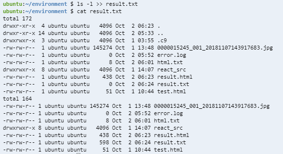 위와 같이 다시 ls -l 을 입력하고 > 대시 >> 을 입력해 result.txt 를 하면
