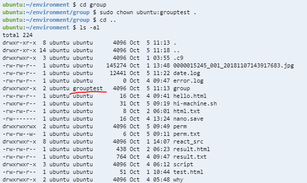 chown 명령어를 실행해주면 해당 디렉토리의 그룹이 grouptest로 바뀐 걸 확인할 수 있다