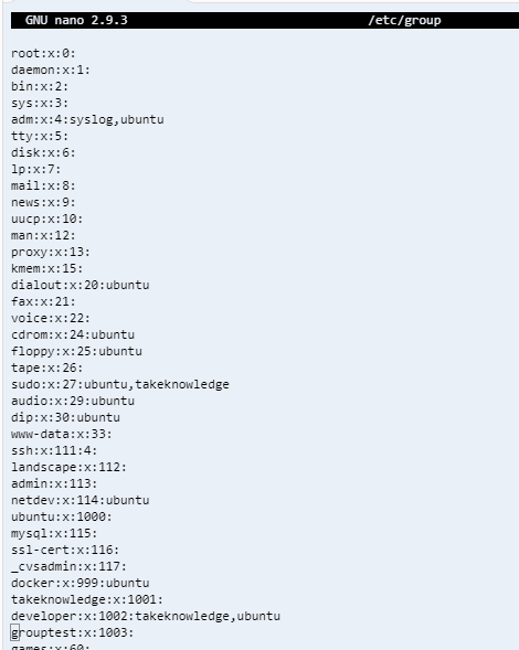 이렇게 명령어를 입력하고 nano 에디터로 /etc/group을 열어보면