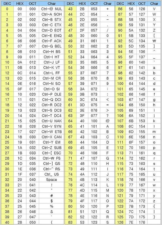 0 ~ 127까지는 아스키 문자 ( 특수기호 및 영어 알파벳 ) 가 할당되어 있고