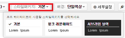 이 두 드롭다운 메뉴를 활용해서 원하는 언어와 스타일 패키지를 선택하고 블로그에 옮길 코드를 적은 뒤