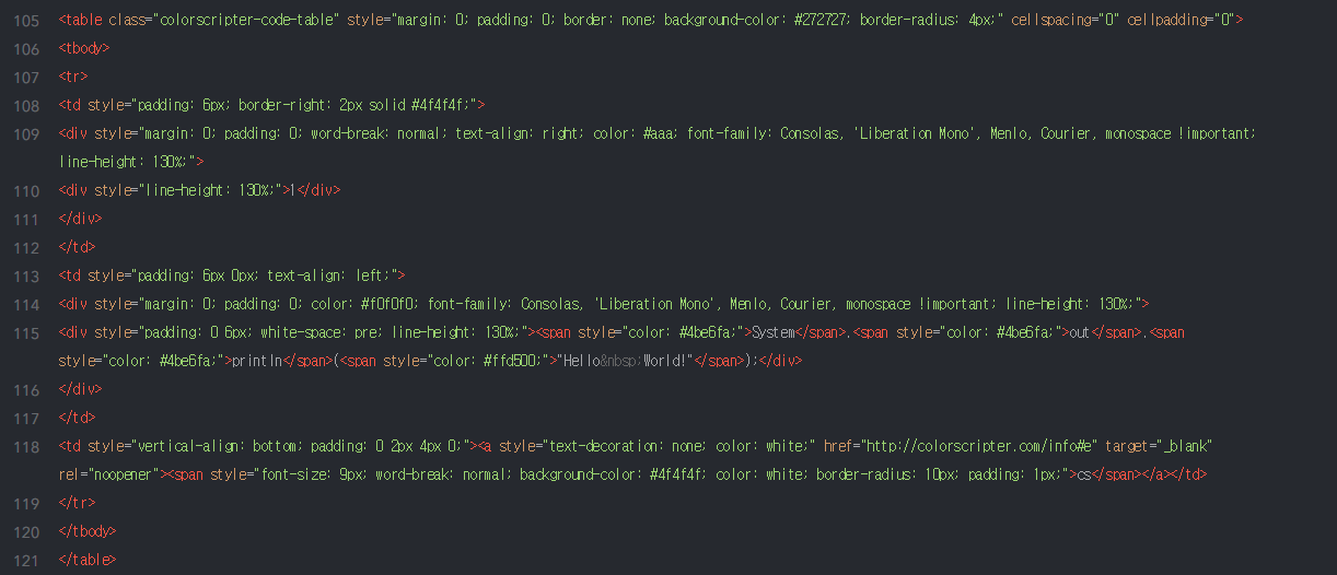 1System.out.println("Hello World!");cs 이렇게 코드가 코드답게 출력된다!