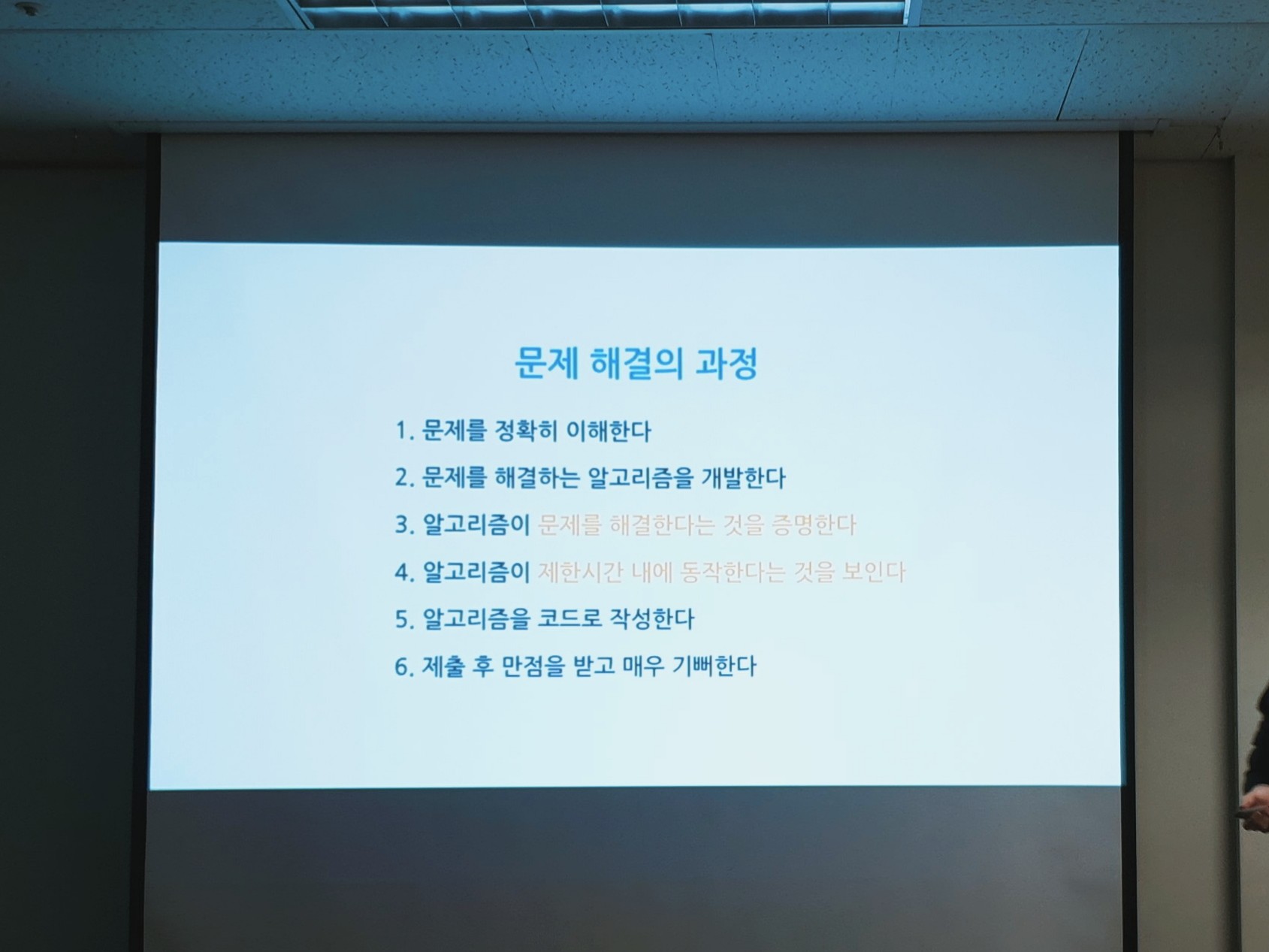 11시 10분경 간단한 소개 후 강연자인 손진호 대표님이 들어오셨고 '이번에 커트라인이 올라갔다'는 얘기로 세미나는 시작됐다. 원래는 3시간에 한 문제만 풀어도 붙을 수 있던게 이번엔 같은 시간에 2문제를 풀어야 합격할 수 있게 상향되었다고. 그래서 알고리즘 잡스에선 개인의 습관을 더욱 최적화 하는 쪽으로 방향을 잡았다고 말씀하셨는데 처음엔 이게 무슨 말인지 몰랐다. 커트라인이 올라갔는데 왜 개인의 습관을 최적화하는 걸 솔루션이라고 하시지? 그러나 세미나가 진행되면서 알고리즘 잡스가 정말 핵심을 제대로 짚고 있구나라는 걸 느꼈다.
