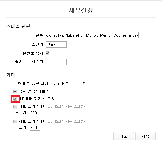 저 'HTML 태그 자체 복사' 부분의 체크가 풀려있는데 저 부분을 체크한 후