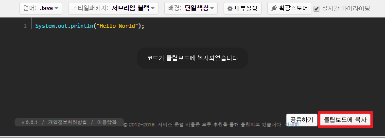 우측 하단에 있는 '클립보드에 복사'를 클릭하면 '코드가 클립보드에 복사되었습니다' 라는 안내가 나온다.
